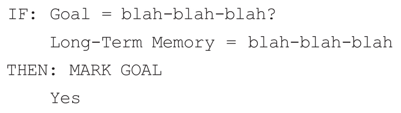 从概念上讲,我们的目标是找到一个问题的答案,如果它所询问的事实是真的,答案就是肯定的。从物理上讲,系统必须确定目标一栏中末尾有问号的一串标记是否在记忆的某些地方也有与之对应的、完全相同的一串标记。一个“小幽灵(后台程序)”被设计用来回答这些查询式问题,方式是通过扫描目标和长时记忆栏,来寻找相同的标记。当它发现一个匹配标记时,它就把标记打印在问题旁边表示它已经得到肯定答案。为了方便起见,我们就说标记是Yes。