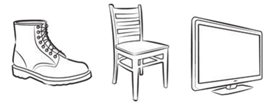这两位研究者随即一起主导了更大范围的研究实验。其中的一次,他俩邀请了一群年轻学生,给了他们60幅速写简笔画,都是如图2-2中的鞋子、椅子、电视等日常用品,但只有图片,没有配上名称,让他们努力记住。这些简笔画都用幻灯片播放,一次一张,每张5秒钟,让这群参与者逐一过目。