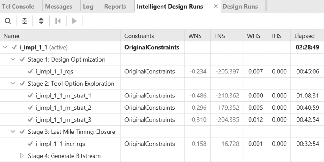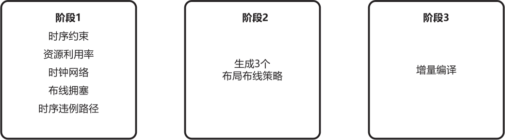 Vivado ML的首个版本是2021.1,其在设计的多个阶段引入了机器学习算法。例如,在综合阶段,引入了基于机器学习算法的门级优化,从而大大提高了综合质量并且将综合时间平均缩短了30%;在布局布线阶段,引入了基于机器学习算法的拥塞评估和延迟评估,从而有效减少了迭代次数并且将布局布线时间平均缩短了20%;最大亮点在于引入了智能设计流程IDR(Intelligent Design Run)。该设计流程专门为时序收敛服务,共包含3个阶段,如图1—33所示。第一阶段,工具会从5个方面即时序约束、资源利用率、时钟网络、布线拥塞和关键路径进行优化,生成相应的优化建议(通常以Tcl脚本方式呈现),并自动将这些建议施加到对应的子步骤(实现阶段的4个子步骤,对应的Tcl命令分别为opt_design、place_design、phys_opt_design和route_design)中。该阶段结束后,工具会将所有的布线后的网表进行比较,选取WNS(Worst Negative Slack,最差建立时间裕量)最大者,获取其中有效的优化建议供第二阶段或第三阶段使用。第二阶段在第一阶段的基础上(继承了第一阶段的结果,即继承有效的优化建议),工具会采用机器学习算法生成3个布局布线策略。第三阶段为增量编译阶段。实验数据表明,IDR可以给设计带来平均10%的收益,即 F max (设计可运行的最高时钟频率)可提升10%。