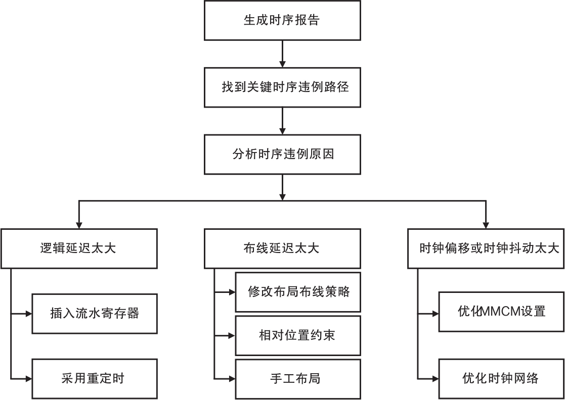 针对布局布线阶段的时序收敛,通常需要采用图1—32所示流程。这个流程的关键点是分析时序违例原因,分析的对象并不是所有的时序违例路径,而是最为关键的几条违例路径。实践表明,往往只需要修复这些关键的违例路径,工具会自动修复其他违例路径。找到原因之后才能有的放矢找到解决办法。一般情况下,建立时间违例原因包括:逻辑延迟太大、布线延迟太大、时钟偏移或时钟抖动太大。若确定原因是逻辑延迟太大,那么可能的解决办法有两种:插入流水寄存器和采用重定时。前者需要修改代码,由于增加流水寄存器会导致从输入到输出所需的时钟周期个数发生改变,涉及多条路径的数据需要重新对齐,改动量可能会比较大;后者无须改动代码,但需要确定是在综合阶段设置重定时还是在布局布线阶段设置重定时,是全局设置(使用全局设置选项)还是局部设置(使用模块化综合技术)。两种解决办法到底哪个是最优解,这些都需要尝试,也都需要设计者积累足够的经验,同时还比较耗时。尤其是多个解决办法无法并行执行时,耗时最为明显。