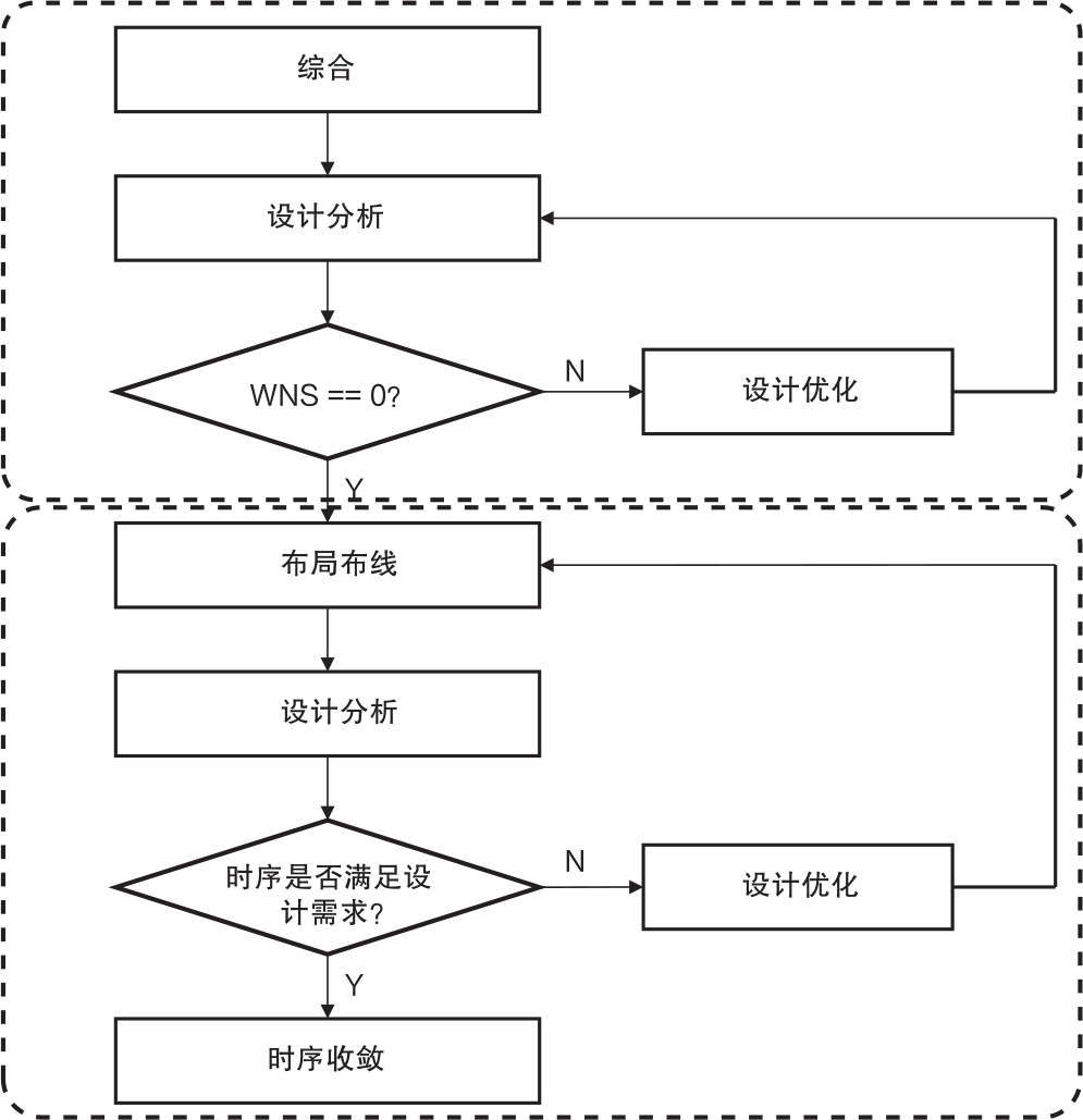 在这些挑战中,时序收敛在多数情况下是设计者面临的最大挑战。传统的时序收敛流程如图1—31所示,分为两大阶段:综合阶段和布局布线阶段。综合阶段只要满足WNS等于0即可进行布局布线,这个目标通常比较容易实现;而布局布线阶段的时序收敛往往牵涉多方因素,需要设计者对工具特性、设计本身都有深入理解,同时有一定的经验积累。因此,这个过程有可能出现反复迭代。