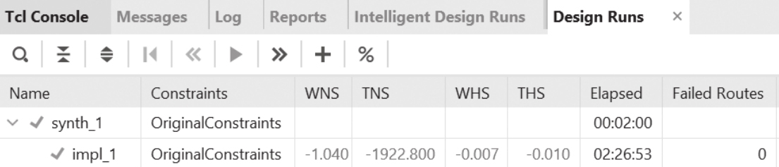 IDR有单独的窗口,如图1—34所示,采用一键式操作,中间过程无须人工干预。从这个角度而言,IDR对设计者的经验积累要求并不高。图1—35显示了未使用IDR时最终的时序性能。与图1—34对比,可以看到IDR将WNS从-1.040ns提升到-0.158ns,同时也修复了保持时间违例。