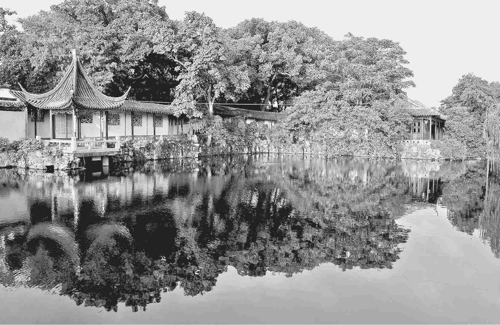 已逢叶落的季节,沧浪亭的园径、阶石上随风铺了一层,闪着嫩黄的颜色。百年的朴树和榉树,叶脱而老干犹存精神。有一棵香樟,树身半偃着,斜向园外的碧池,鳞波贴紧枝叶缓缓散去。
