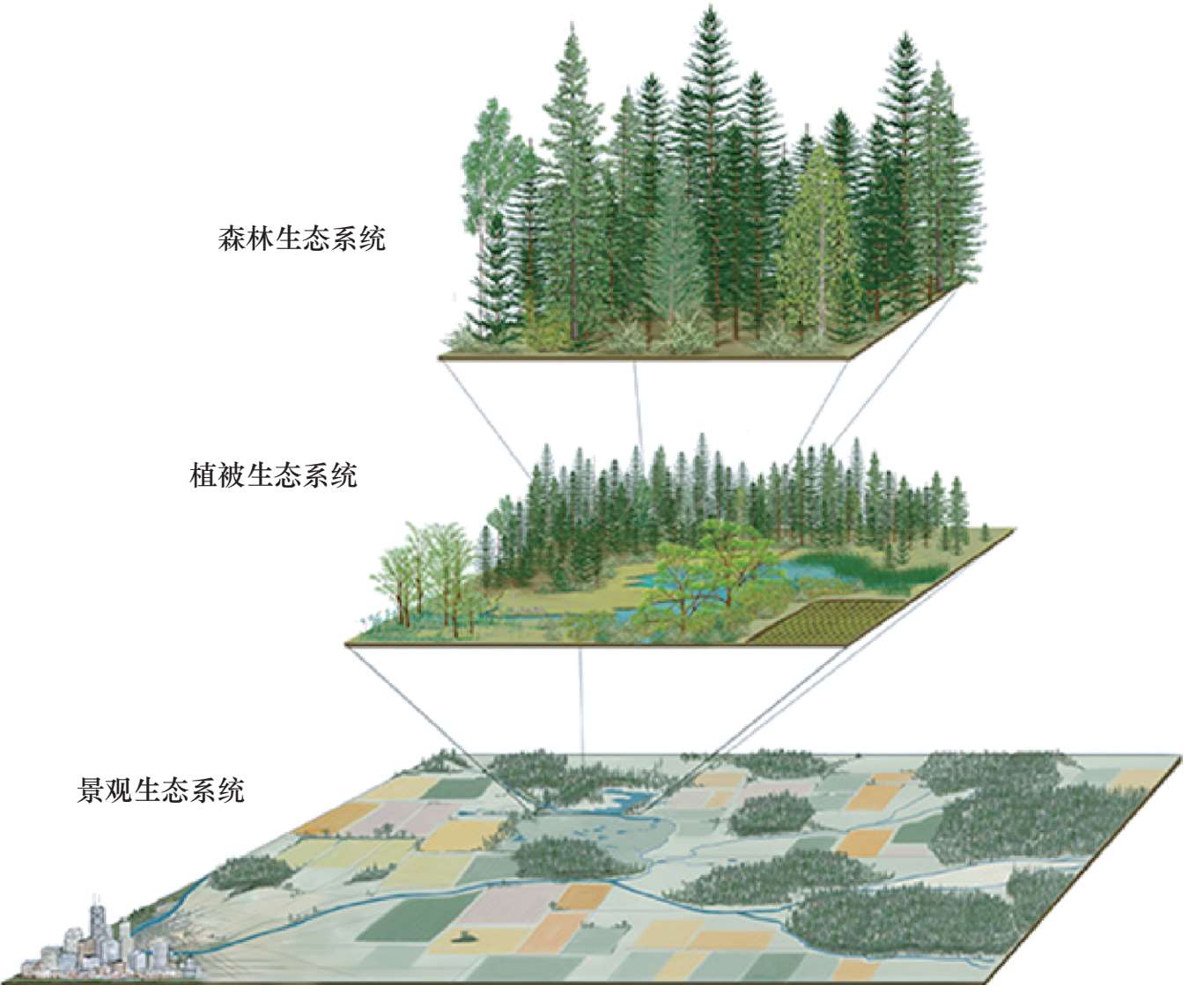 生态系统是一种整体性、系统性的概念。在实际应用中景观生态系统(Landscape Ecosystem),或者国土生态系统,就是把生态系统跟空间维度联系起来。或者说,有了景观,生态系统就有了载体或基底。某一个空间单元的生态系统,统称某一景观生态系统。比如天津市蓟州区的景观生态系统(国土生态系统),就有具体的空间实体、研究目标和研究范围。蓟州区景观生态系统可以细分为森林生态系统、草地生态系统、水流域生态系统、农田生态系统、城市生态系统等。我们说消化系统是以功能为分类,当我们说肠胃系统,就是具体的实体,这一肠胃系统可以再分为胃系统、肠系统,肠系统又可进一步分为大肠系统、小肠系统等。同理,景观生态系统可以包含森林生态系统、植被生态系统、国土生态系统。景观生态系统的引入,对国土空间生态保护、国土生态系统研究有了可实施空间(景观空间、国土空间)的意义。由此,我们引入景观生态系统最重要的空间尺度概念(图 2.1)。