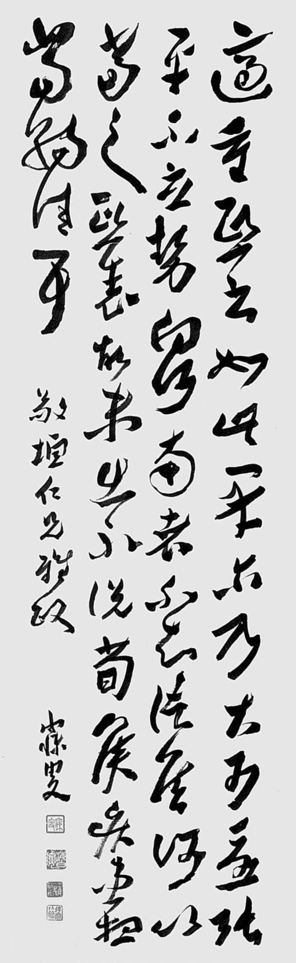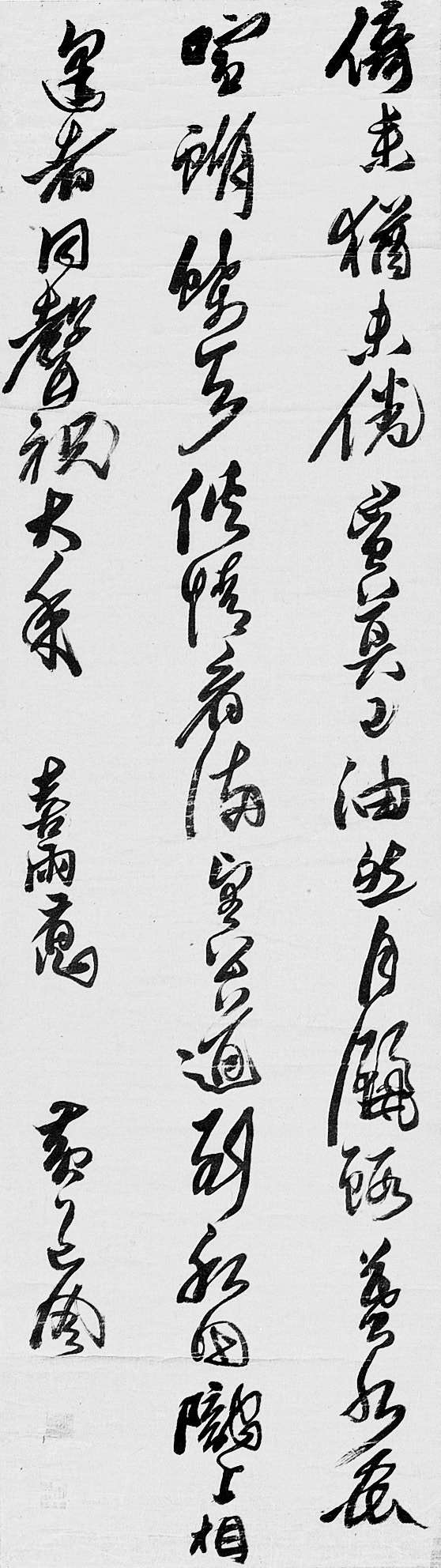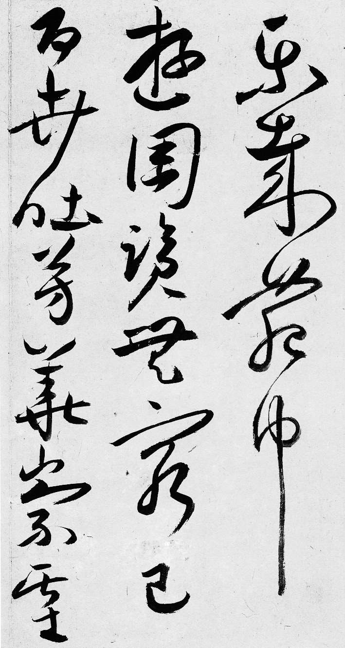 在清初,八大山人以简净的草书风格独立于书坛。八大山人名朱耷,系明朝宗室。山人擅正、行、草、隶各体,但最突出、最具面目的当数草书,笔致简练,结体疏落。(图15)影响他草书风格的主要有张旭、怀素、黄山谷、米芾、王宠、董其昌等,其取法广泛,最终以强烈的个人风格出现于清朝书坛。山人草书脱尽明人习气,别树一帜,令人耳目一新。虽然他的草书影响远不及绘画之深远,但其所特具的艺术性,无疑是草书园地中的一朵奇葩。