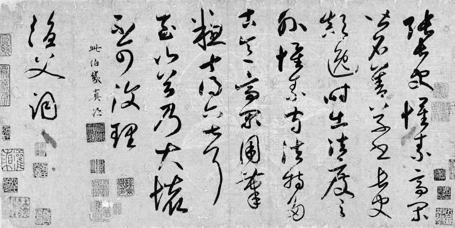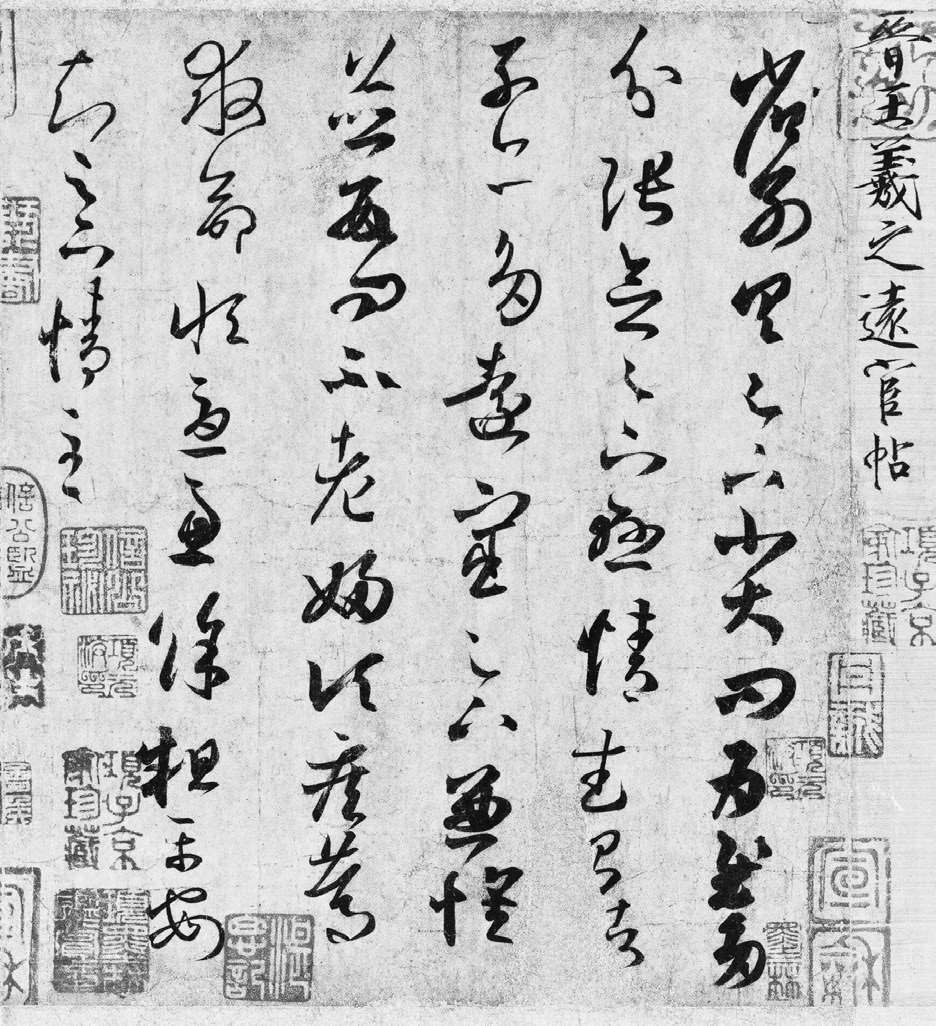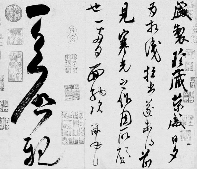 正由于张旭草书特具的艺术力,迅即震动当时的书坛,以至杜甫、李白、韩愈、颜真卿等无不撰文吟诗以赞之,书名盛极一时。在文宗时,诏以李白歌诗、裴旻剑舞、张旭草书为“三绝”。