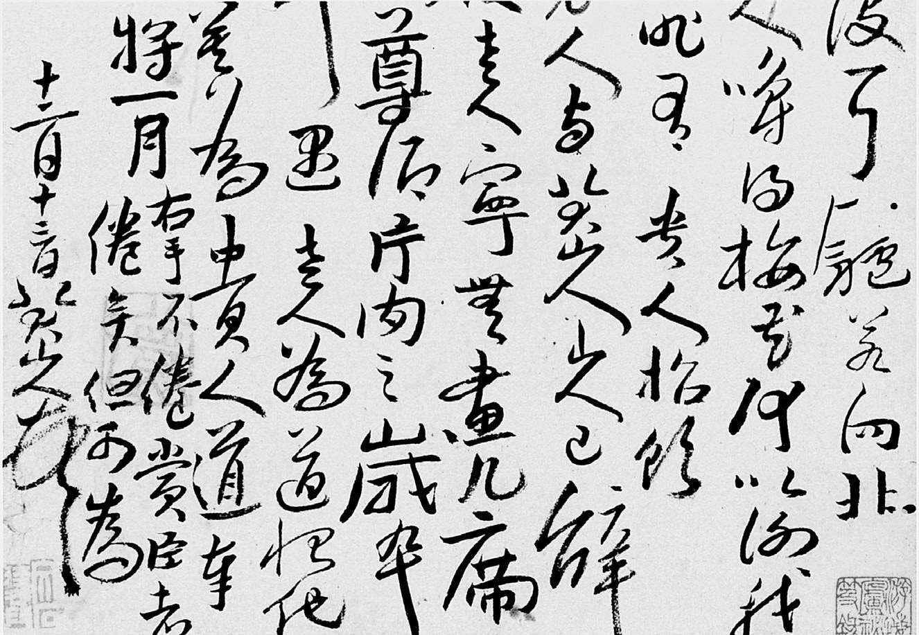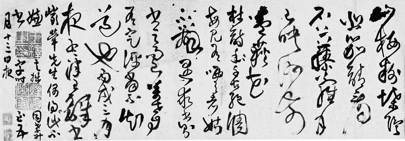 明人善草者尚有解缙、张弼、丰坊、徐渭等,其中尤值得一提的是徐渭。自“书画同源”这一观点被文人士大夫认可并躬自实践以来,能把草书和绘画紧密结合,并取得卓越成就的书画家,有明一代当首推徐渭。