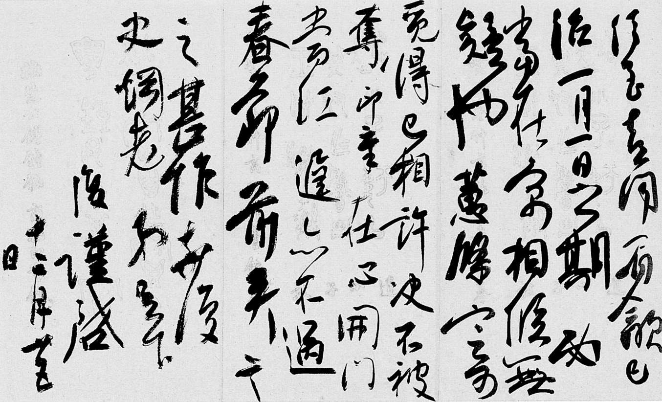当然,近现代草书的发展还远不止以上三个方面。譬如,清人极少研究、取法的明人草书,尽管书家多,作品广,但由于清代中后期重碑的风气,致使在当时尚未引起足够的重视,而近现代随着明人作品的大量公之于世,已越来越受到中外学者的关注。此外,近现代大量汉、魏竹木简的出土,又提供了连唐、宋人也难得一睹的汉、魏人墨迹,而在这方面的研习和探索,尚属方兴未艾。