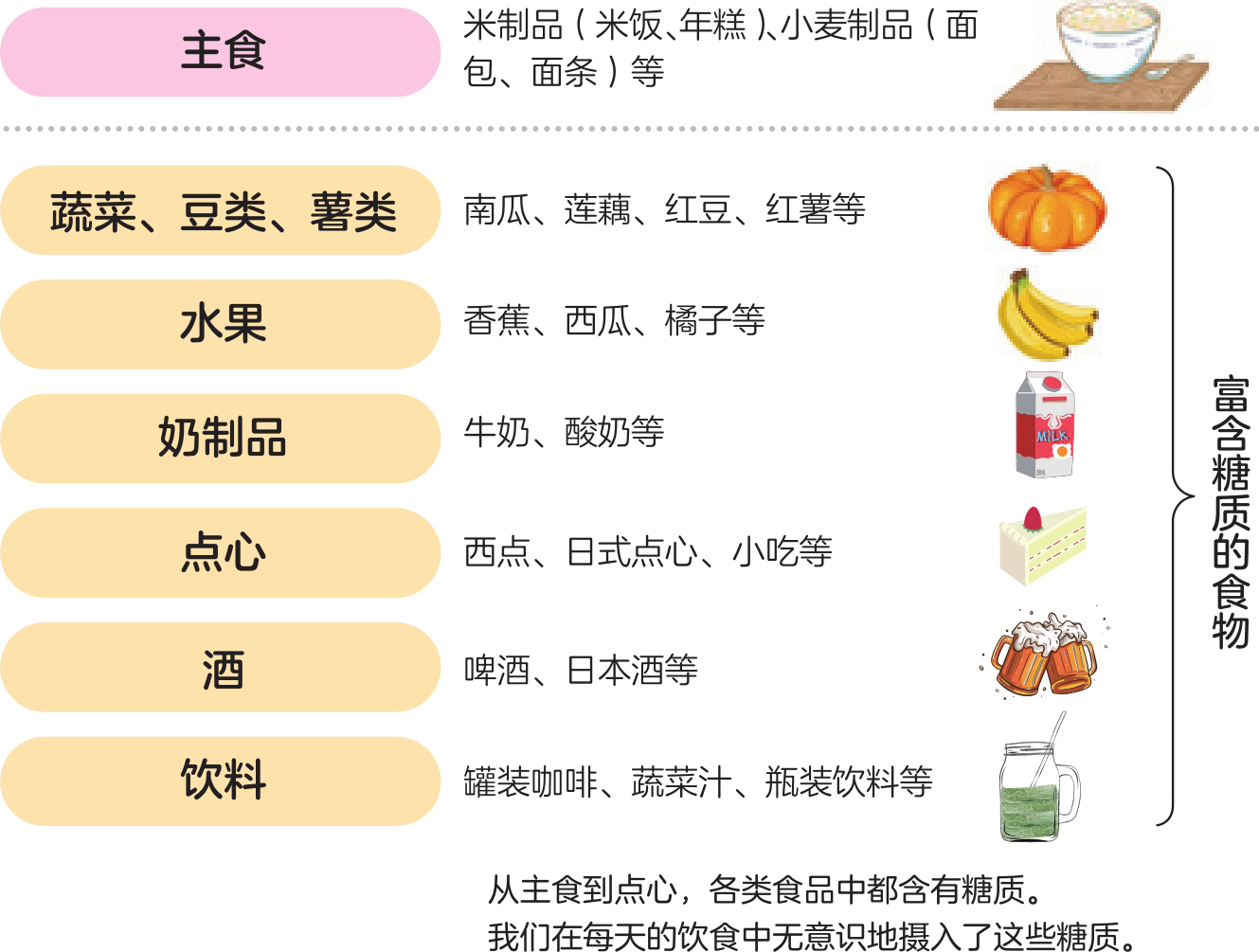 对于像点心这种能让人充分感受到甜味的东西,我们只要不吃就可以了。但是糖质并不一定都是甜的,所有的食品中都含有糖质。所以,到底什么样的食物中糖质含量较多呢?糖质摄入过多又会对健康造成什么样的危害呢?如果不正确理解这些问题的话,糖质便会在不知不觉中侵蚀你的健康。