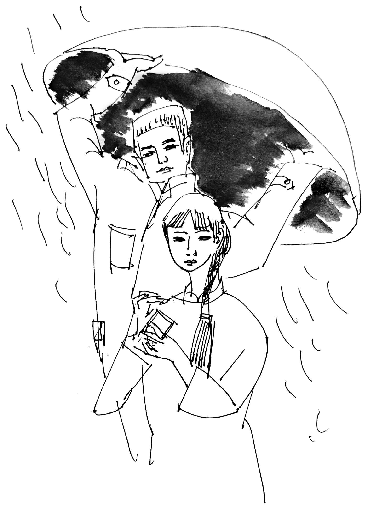 岔道相遇,两人互望,姑娘愣了一下,一前一后,风撵脚步。也就几十步的光阴,云中一道光闪,雷就惊了,雨就来了。