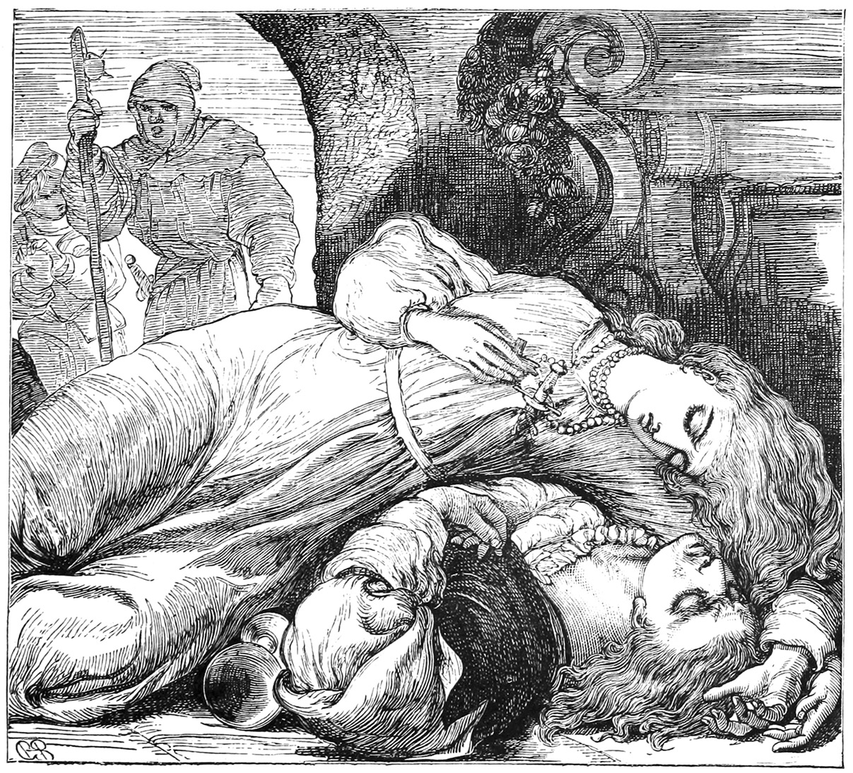 朱丽叶 啊,人声吗?那我必须快点了结。啊,好刀子!(攫住罗密欧的匕首)这就是你的鞘子;(以匕首自刺)插进来吧,让我死去。(扑在罗密欧身上死去)