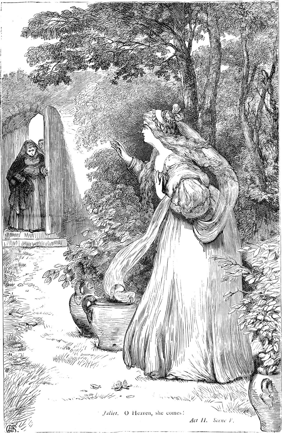 朱丽叶 啊,上帝!她来了。啊,好心肝奶妈!什么消息?你碰到他了吗?叫那个人出去。