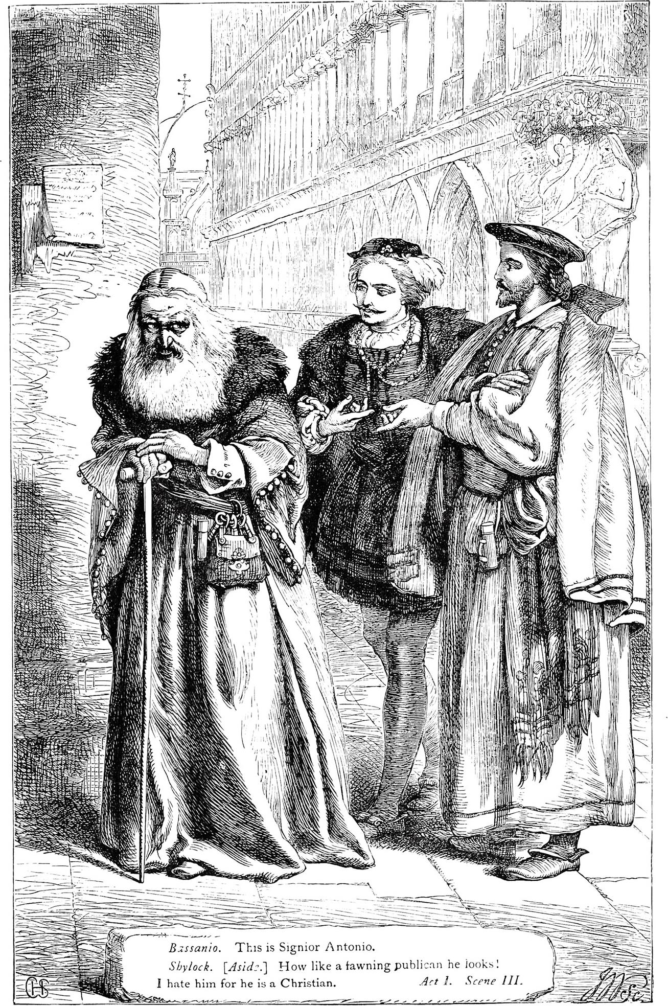 夏洛克 (旁白)他的样子多么像一个摇尾乞怜的税吏!我恨他因为他是个基督徒,可是尤其因为他是个傻子,借钱给人不取利钱,把咱们在威尼斯城里放债的这一行的利息都压低了。要是我有一天抓住他的把柄,一定要痛痛快快地向他报复我的深仇宿怨。他憎恶我们神圣的民族,甚至在商人会集的地方当众辱骂我,辱骂我的交易,辱骂我辛辛苦苦赚下来的钱,说那些都是盘剥得来的腌臜钱。要是我饶过了他,我们的民族永远没有翻身的日子!