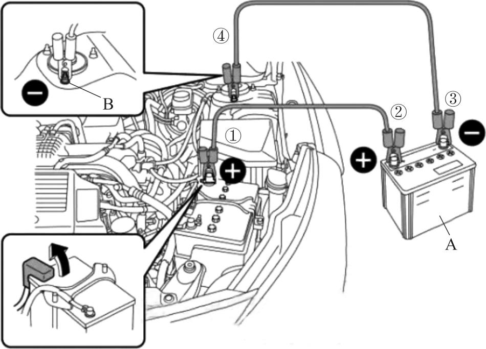 如图1-2-23所示,车辆进行跨接起动时,第①步用跨接导线连接待起动车辆上蓄电池的正极,另一端连接供电蓄电池的正极(第②步),第③步用跨接导线连接供电蓄电池的负极,第④步将跨接导线的另一端连接在待起动车辆的搭铁上。
