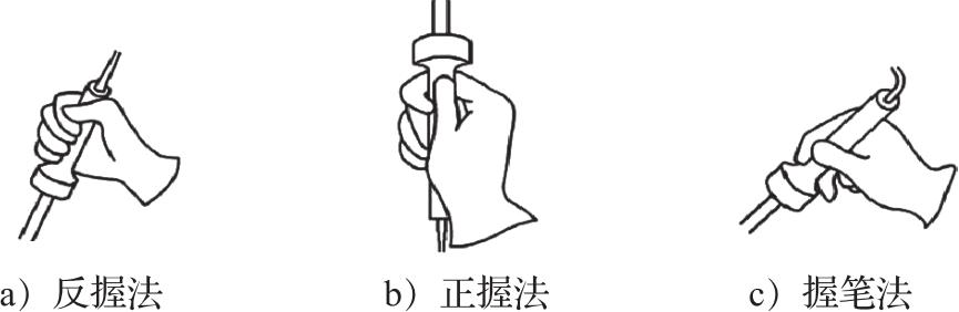 ①电烙铁的握法:如图1-2-14所示,有3种握法。反握法适用于大功率电烙铁,焊接散热量较大的被焊件。正握法使用的电烙铁也比较大,且多为弯形烙铁头。握笔法适用于小功率的电烙铁,焊接散热量小的被焊件,如收音机、电视机、控制单元等的印制电路板的焊接维修。