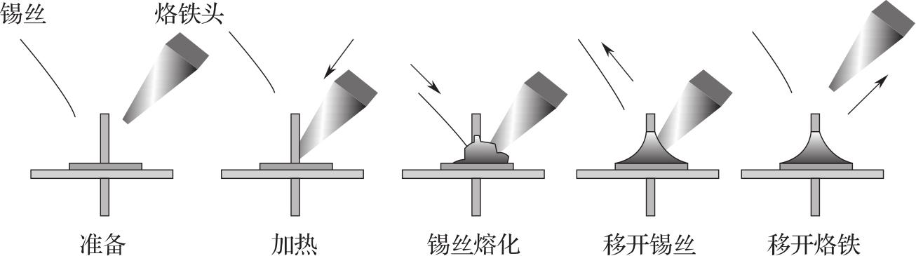 3)熔化焊料。 当焊件加热到能熔化焊料的温度后将焊丝置于焊点,焊料开始熔化并润湿焊点。