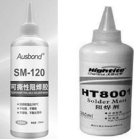 3)阻焊剂。 阻焊剂(图1-2-17)是一种耐高温的涂料,可使焊接只在所需要焊接的焊点上进行,而将不需要焊接的部分保护起来,以防止焊接过程中的桥连,减少返修,节约焊料,使焊接时印制电路板受到的热冲击小,板面不易起泡和分层。阻焊剂的种类有热固化型阻焊剂、光敏阻焊剂及电子束辐射固化型等几种,目前常用的是光敏阻焊剂。