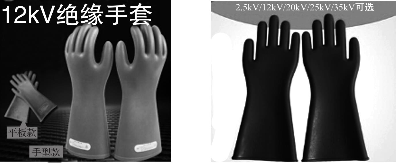 橡胶材质的电工绝缘手套具备两种性能:一是在进行高电压部件或线路操作时,能够承受1000V以上的工作电压;二是具备抗酸碱性,当工作中接触来自动力电池泄漏的氢氧化物等腐蚀性化学物质时,能防止这些物质对人体造成伤害。图2-1-26是各种类型的电工绝缘手套。