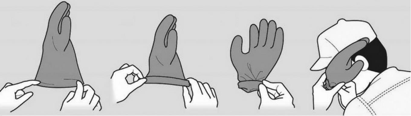 电工绝缘手套需要定期检验,确保耐高电压合格并在有效期内,而且在每次使用前必须进行泄漏检查。检查的方法是向手套内注入一定的空气,判断绝缘手套是否有漏气。图2-1-27是绝缘手套检查方法。