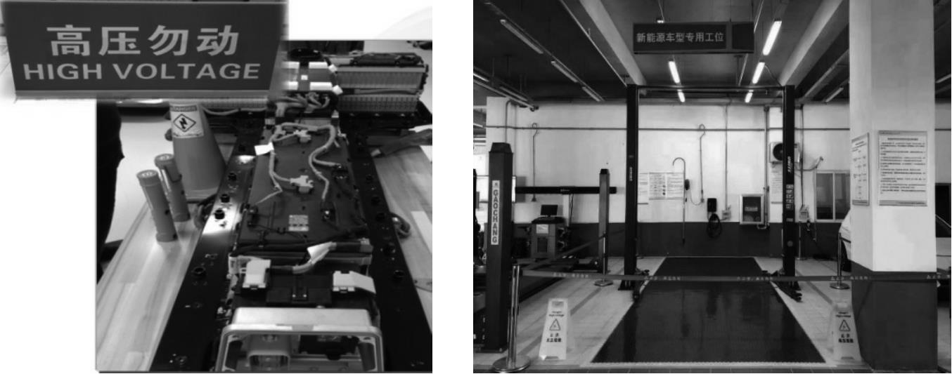 在高压维修工位或车辆、高压部件附近必须放置明显的警告标识,防止无关人员进入工位或触摸高压部件,发生触电事故。图2-1-25是新能源汽车维修专用工位的安全警告标识及隔离带。