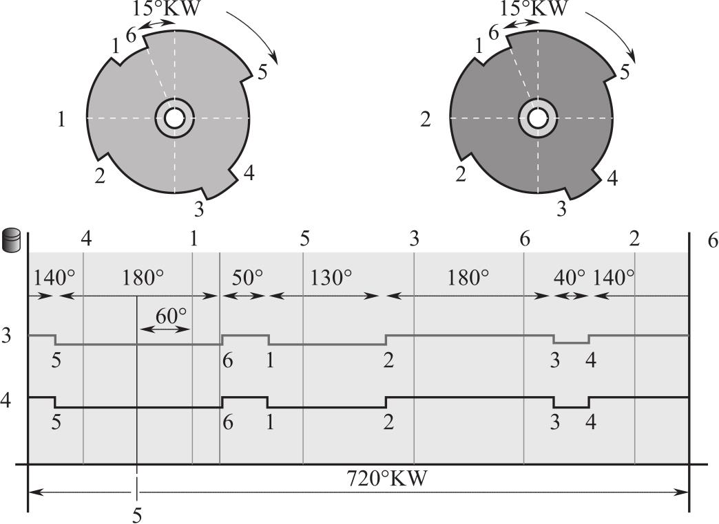 1-进气凸轮轴 2-排气凸轮轴 3-进气凸轮轴信号 4-排气凸轮轴信号5-气缸1上止点参考标记 6-气缸编号