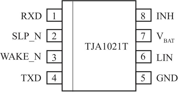 图1-1-37是某型号汽油直喷发动机ECU内部结构示意图。在ECU内部,使用了很多集成电路,中间是微处理器,下方是传感器,上方是电源供给,PMIC是电源管理芯片;左侧是总线(CAN、LIN、FlexRay)收发器;右侧是功率输出级,包括H桥驱动(Half-bridge)和低边驱动(low-side driver)。图1-1-38、图1-1-39分别是LIN驱动芯片针脚和实物。