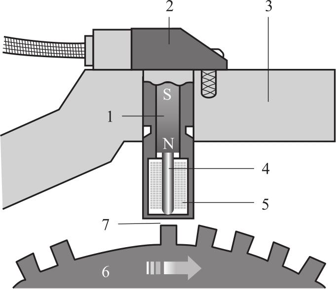 1-永久磁铁 2-传感器壳体 3-发动机壳体 4-软铁心 5-线圈 6-信号齿圈(基准标记)7-气隙