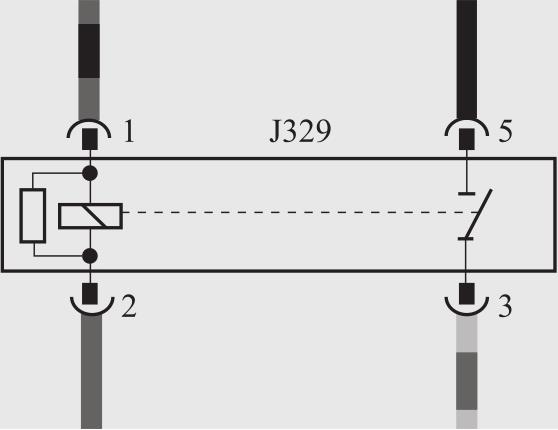 图1-1-27(大众汽车J329继电器)中,1号脚是线圈正极,2号脚是线圈负极接地,3号脚接正极,5号脚是继电器输出端。