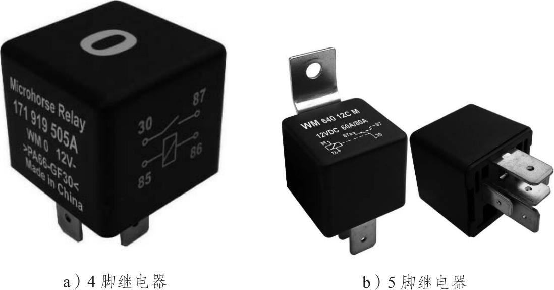1)继电器: 继电器是利用电磁线圈工作的常用电气元件。它的主要功能是实现小电流控制大电流,并实现电气隔离。如图1-1-26a所示,继电器常见的类型是4脚继电器,85和86是线圈的两端,30是常电源供电端,87是继电器电源输出端。这种类型的继电器是常开触点继电器。当线圈通电时,有电流流过电磁线圈,线圈产生电磁吸力,将触点闭合,继电器工作。图1-1-26b所示是5脚继电器,其中87a端子是常闭触点,87是常开触点。继电器不工作时,常闭触点保持闭合;继电器工作时,87a断开,87触点闭合。