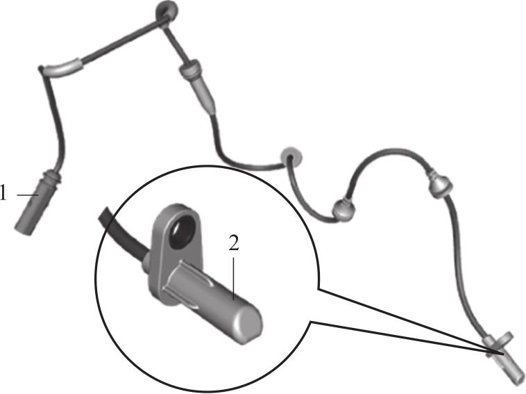 图1-1-16是宝马汽车采用的一种轮速传感器,图1-1-17显示了其内部结构。在车轮轴承密封件中安装了48对磁极。车轮转速传感器由2个霍尔传感器和1个电子分析装置组成。这类传感器输出方波波形,有别于传统的磁电式传感器波形。