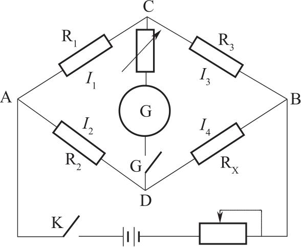 常用的半导体压力传感器选用N型硅片作为基片。先把硅片制成一定几何形状的弹性受力部件,在此硅片的受力部位,沿不同的晶向制作四个P型扩散电阻,然后用这四个电阻构成惠斯通电桥,在外力作用下电阻值的变化就变成电信号输出。这个具有压力效应的惠斯通电桥是压力传感器的心脏,通常称为压阻电桥。图1-1-22是惠斯通电桥的模型。