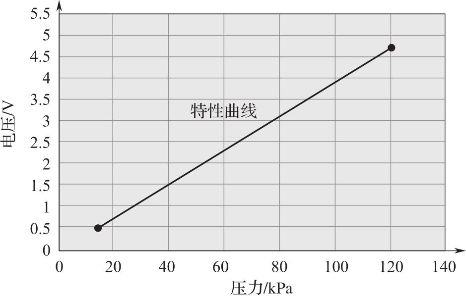 图1-1-23是空调制冷循环系统压力传感器;图1-1-24是发动机进气系统的进气压力传感器。图1-1-25是压力传感器的线性输出特性曲线。