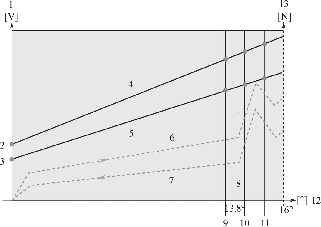 1-传感器电压 2-传感器1在怠速下的信号电压 3-传感器2在怠速下的信号电压 4-传感器1输出信号变化过程5-传感器2输出信号变化过程 6-不断增大的制动踏板力特性线 7-不断减小的制动踏板力特性线(减速)8-由于强迫降档开关开始提高制动踏板力或由于强迫降档结束减小制动踏板力 9-不带强迫降档的满负荷位置10-强迫降档关闭 11-强迫降档接通 12-加速踏板角度 13-制动踏板力