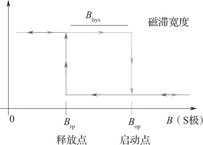 1)开关型霍尔: 图1-1-15是开关型(单级)霍尔的特性图。单级霍尔需要指定一个磁极,一般都是指定S极。当磁场靠近时霍尔元件导通,输出低电平;磁场远离时霍尔元件断开,输出高电平,而另一磁极始终保持高电平的状态。根据单级霍尔这种特性,可以使用一个磁铁或者类似的磁场来进行各种应用。