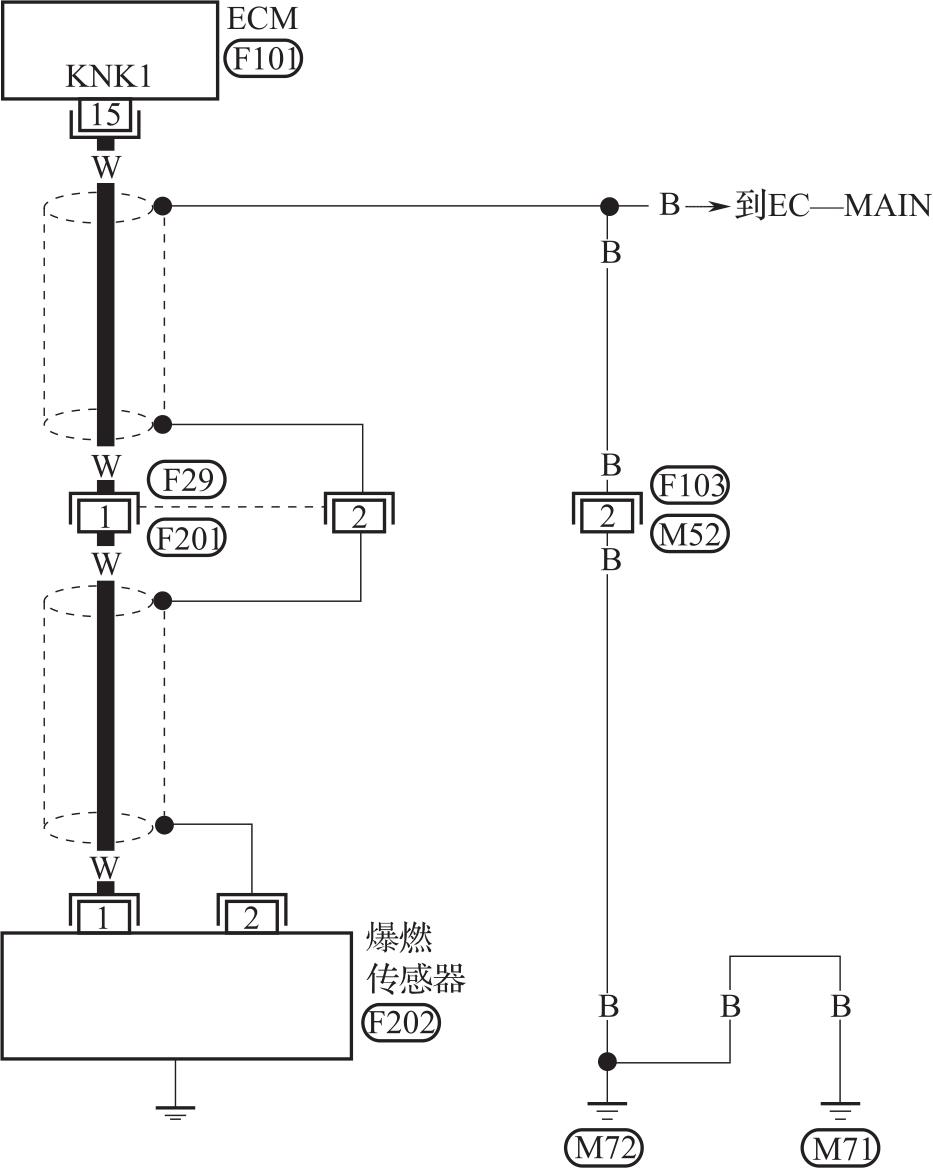 为了避免信号受到干扰,对于产生持续变化或微弱信号的传感器,信号线外皮通常会有屏蔽线,屏蔽线可能占用传感器插接器的针脚,也可能不占用。图1-1-44是爆燃传感器的电路图,连接爆燃传感器与发动机控制模块ECM的导线外部即包含有屏蔽线(图中的虚线),从图中可以看出,爆燃传感器一侧的屏蔽线连接到传感器的2号针脚,而ECM一侧的屏蔽线则不占用ECM的针脚。
