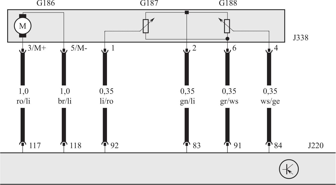 J220-发动机电控单元J338-电子节气门总成G186-节气门电动机G187-节气门位置信号1 G188-节气门位置信号2