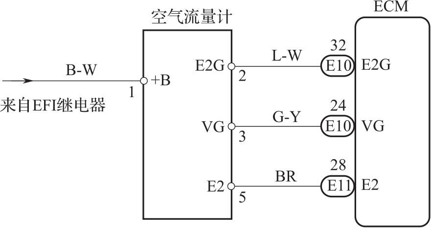 图1-1-40是丰田汽车热线式空气流量计的电路图,加热电源(1号针脚+B)来自电子燃油喷射系统EFI继电器。