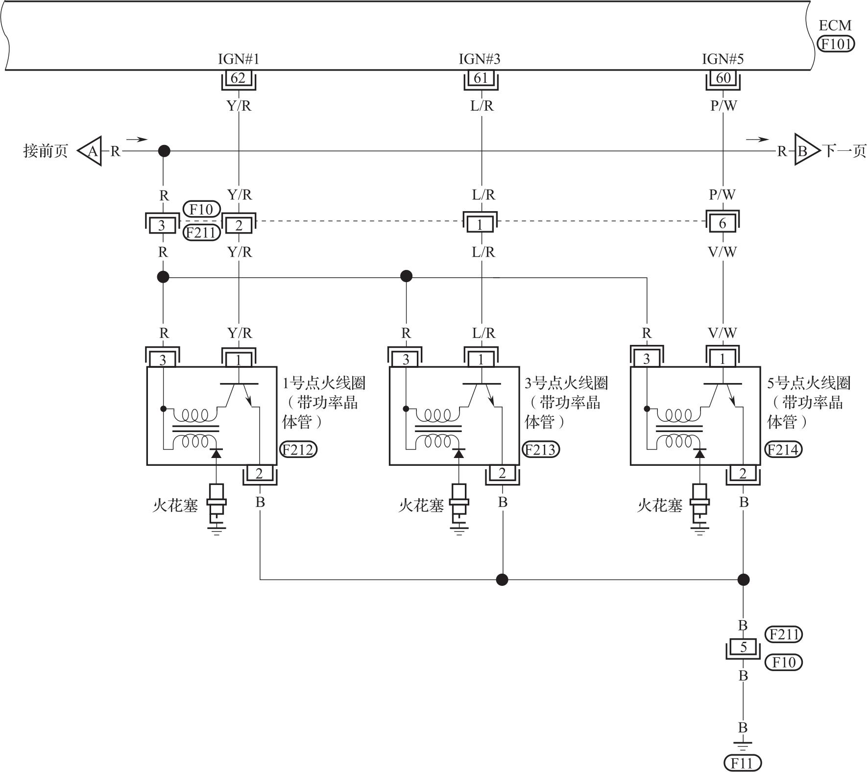 图1-1-42是日产汽车独立点火系统电路图,图中1号、3号、5号点火线圈的2号针脚导线汇集到一起,在车身编号为“F11”的搭铁点,连接到车身金属部分。