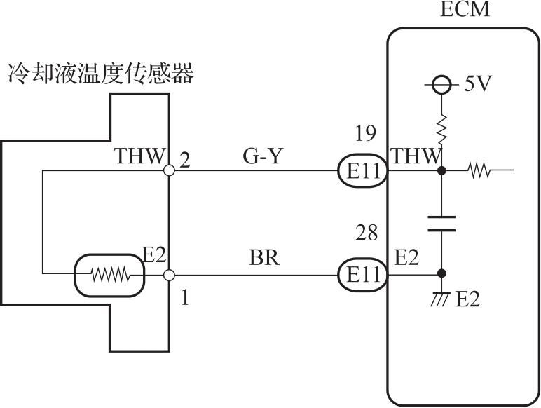 图1-1-41是丰田汽车冷却液温度传感器的电路图,参考电源(2号针脚THW)来自电控模块ECM(E11插接器19号针脚THW的5V电压)。