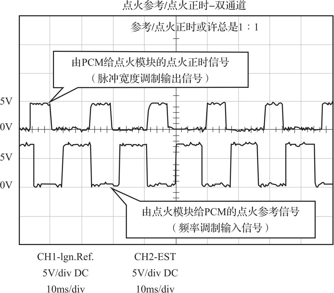 图1-1-49是通用汽车动力控制模块PCM与点火模块ICM之间的点火正时控制信号波形,图中由点火模块给PCM的点火参考信号是脉冲频率调制输入信号,频率(即转速信号)会变化,但占空比不会变化;由PCM给点火模块的点火正时信号是脉宽调制输出信号,脉冲宽度(即点火正时)会随着发动机工况变化而变化。