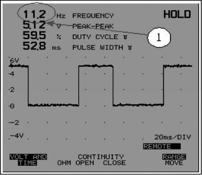 图1-1-47是霍尔式曲轴位置传感器产生的脉冲频率调制信号波形,波形是方形的,因此俗称“方波”。脉冲频率调制信号是固定的脉冲信号,在发动机运转中,波形的频率(图1-1-47中①的指示)发生改变,每个工作循环的占空比(%DUTY CYCLE)不会发生变化,但脉冲宽度(ms PULSE WIDTH)会随频率变化而变化。