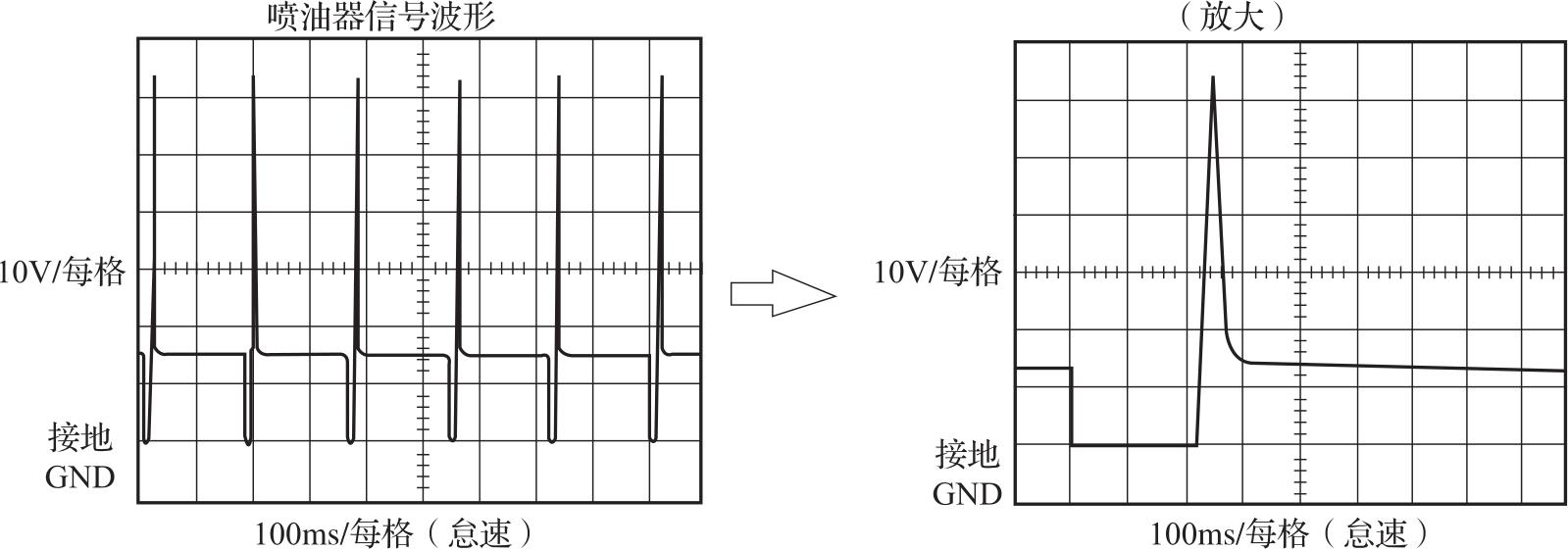 图1-1-48是电子燃油喷射系统的喷油器控制信号波形,在喷油器工作过程中,脉冲宽度(即喷油器喷油时间)是会随着发动机工况变化而变化。