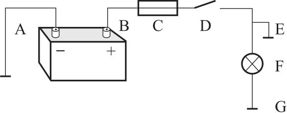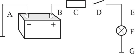 同理,在蓄电池正极侧B、熔断器C、开关侧D、任一处导线E、负载灯泡F、搭铁G发生了断路,整个电路没有电流流过,电路不能工作,即出现电路断路的故障。