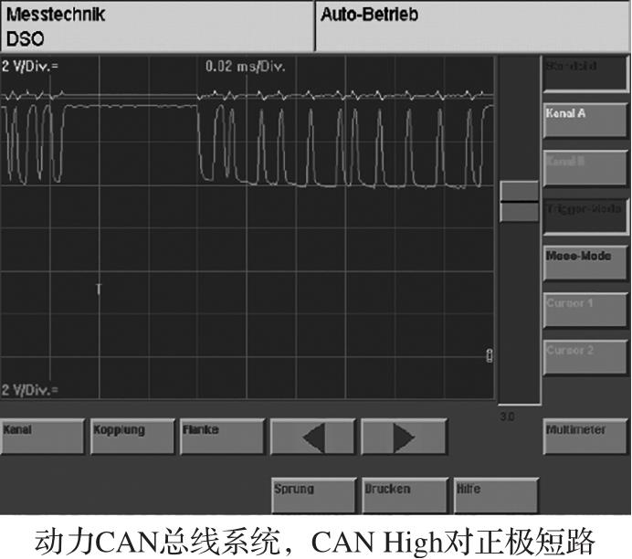 在图1-2-7中,CAN总线上线信号电压介于0~5V之间。如果某条CAN线上的电压出现了12V,则表明该条总线信号线对正极短路。同理,LIN、Flex Ray、CAN FD总线也会出现对正极或对负极短路的情形。
