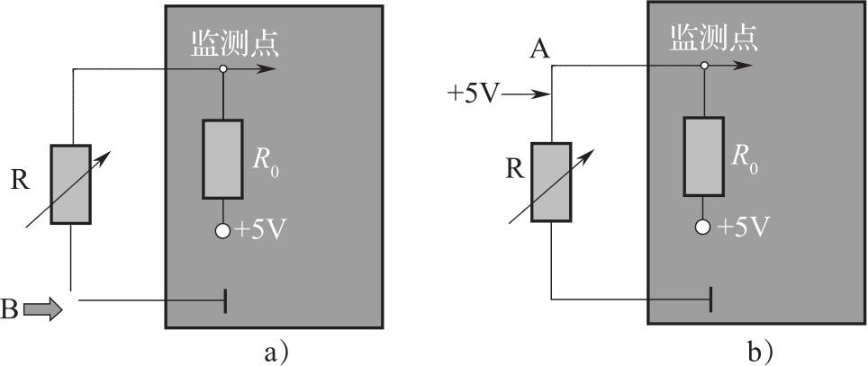 图1-2-6是一个温度传感器信号电路的模型。在图1-2-6a中,在B点发生了断路故障,此时监测点电压经上拉电阻 R 0 作用为+5V。对于正常电路,监测点电压应小于+5V,此时监测点的+5V电压就表明出现了对正极短路故障。这里的正极,是+5V传感器供电电压的极值。同理,在图1-2-6b中,如果在A点串入+5V电压,甚至12V电压,电路仍报对正极短路故障。