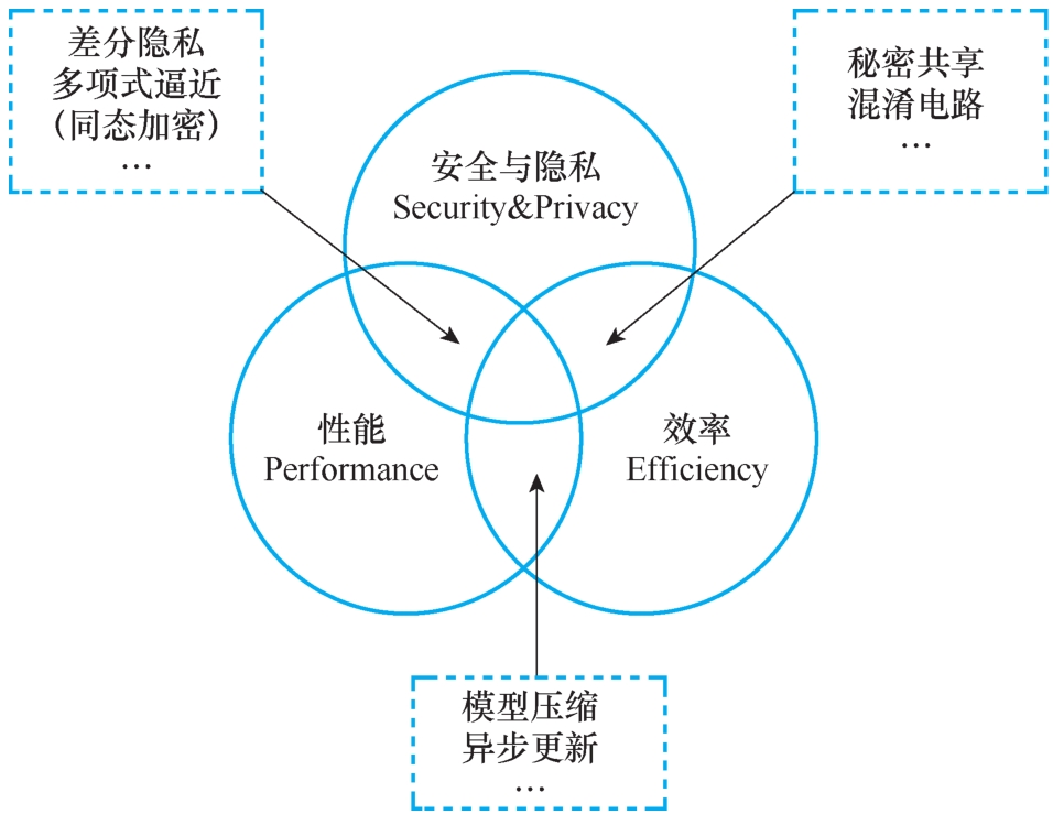 图1-2展示了联邦学习不同挑战之间的相互关系。为了增强联邦学习的安全与隐私性,在一些严格要求隐私保证的系统中,联邦学习需要与其他隐私保护技术相结合,当使用差分隐私、多项式逼近等技术进行隐私保护的时候,模型就会为了安全和隐私牺牲部分性能。同样,当使用其他密码学技术,如与秘密共享、混淆电路等相结合时,加密计算对应负载又会使得联邦学习的效率降低。同样,异步更新、通信频率等超参数调优也是联邦学习为了平衡性能与效率,在工程化时需要考虑的因素。