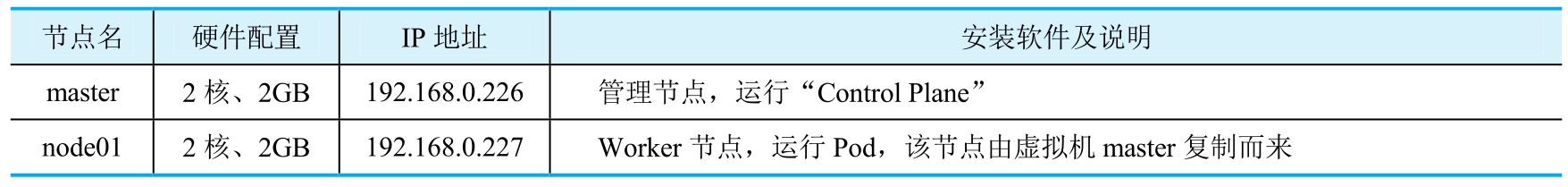 本章构建一个最简的Kubernetes集群,包括1个Master节点和1个Node节点,具体集群规划如表2-1所示。