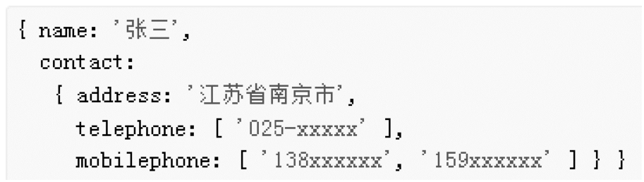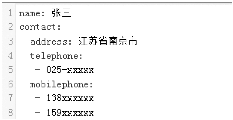 假设一个顾客(resource)Object的数据,包括两个成员:第一个成员是string类型,Key为name,Value值是张三;第二个成员是Object,Key是contact,Value有3个成员,其中第一个成员的Key是address,Value值是“江苏省南京市”,第二个成员的Key是telephone,Value是数组,包含一个值025-xxxxx,第三个成员的Key是mobilephone,Value是数组,包含两个值,分别是138xxxxxx和159xxxxxx。将上述Object写入YMAL文件,内容如图3-1所示。