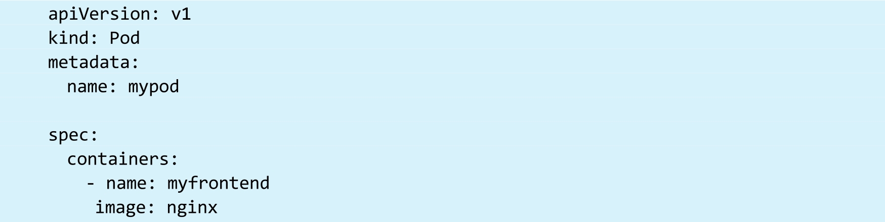4)第4个成员也是一个对象,Key是spec,有1个成员containers,containers是一个Object数组,数组中有1个元素,该元素有两个成员,第一个成员的Key是name,Value值是myfrontend,第二个成员的Key是image,Value值是nginx。表明该Pod只有1个容器,容器的名字为myfrontend,镜像的名字为nginx。