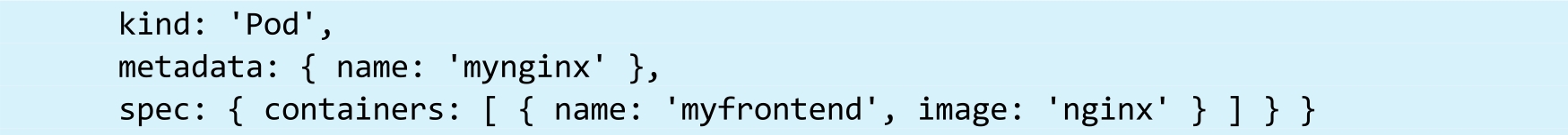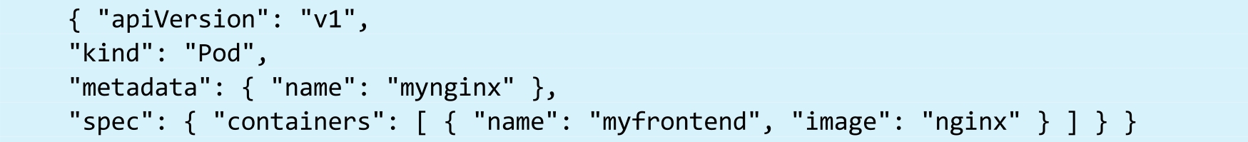上述内容由我们在http://nodeca.github.io/js-yaml/中输入pod.yml内容转换而来,转换后的内容如下所示。注意要给以下内容的每个Key和Value加上双引号",才能转换成kubectl所能解析的JSON格式。